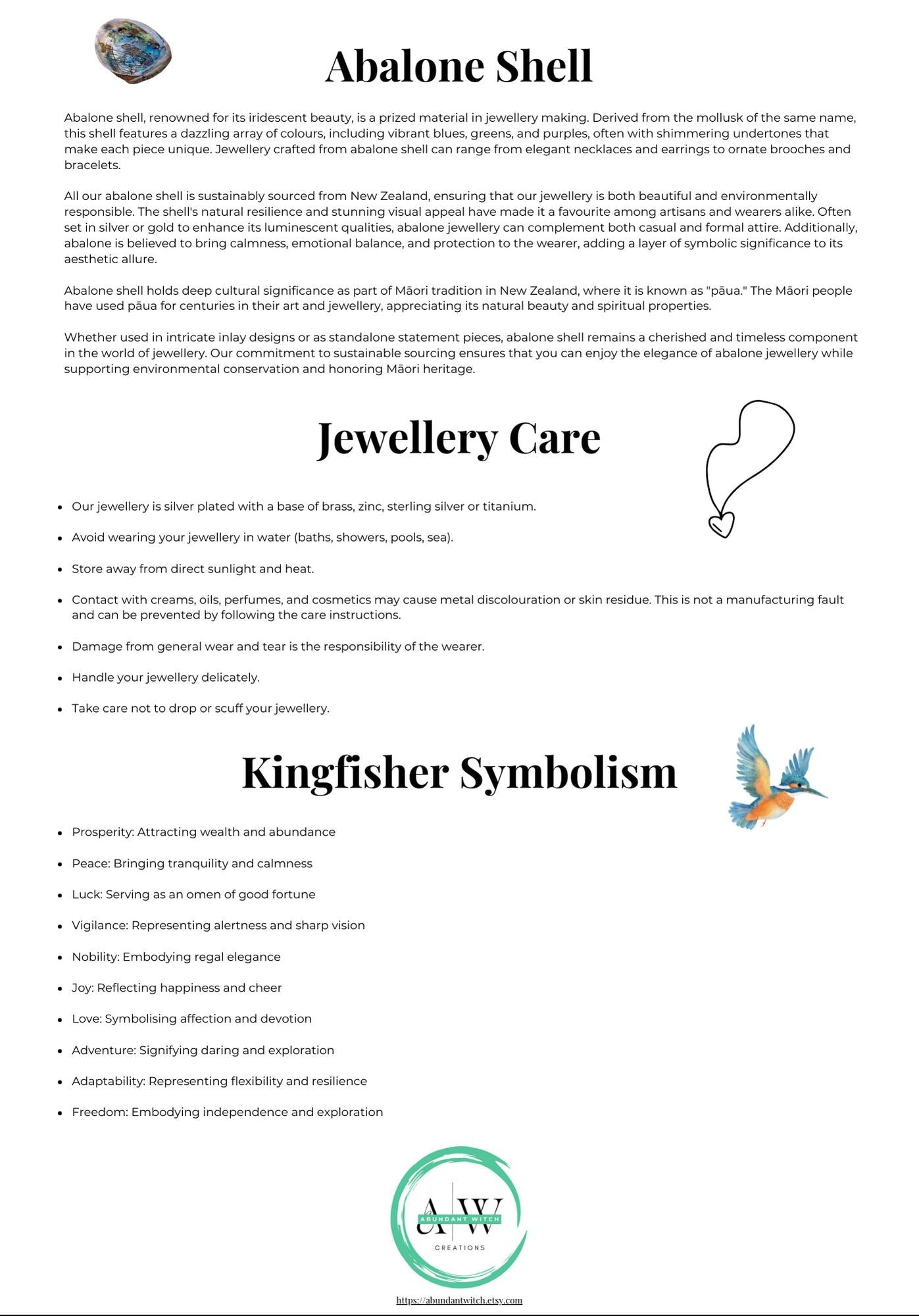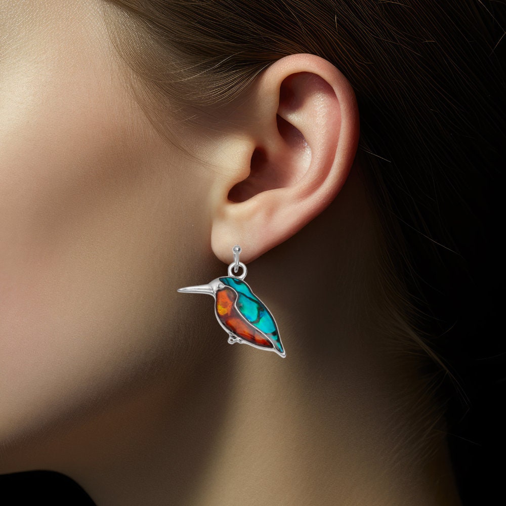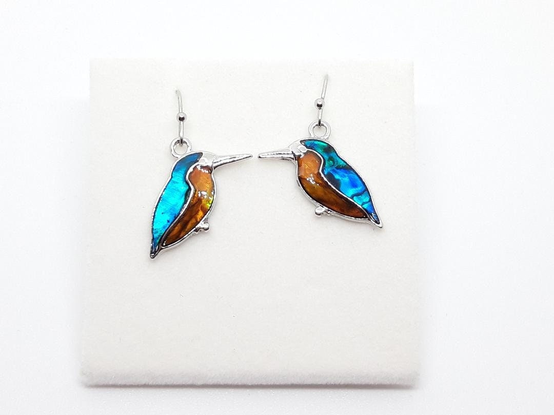 Celebrate the beauty of nature with these stunning kingfisher bird earrings, featuring shimmering abalone shell. The intricate design and vibrant colours of the kingfisher bring a touch of elegance and symbolism to your jewellery collection.