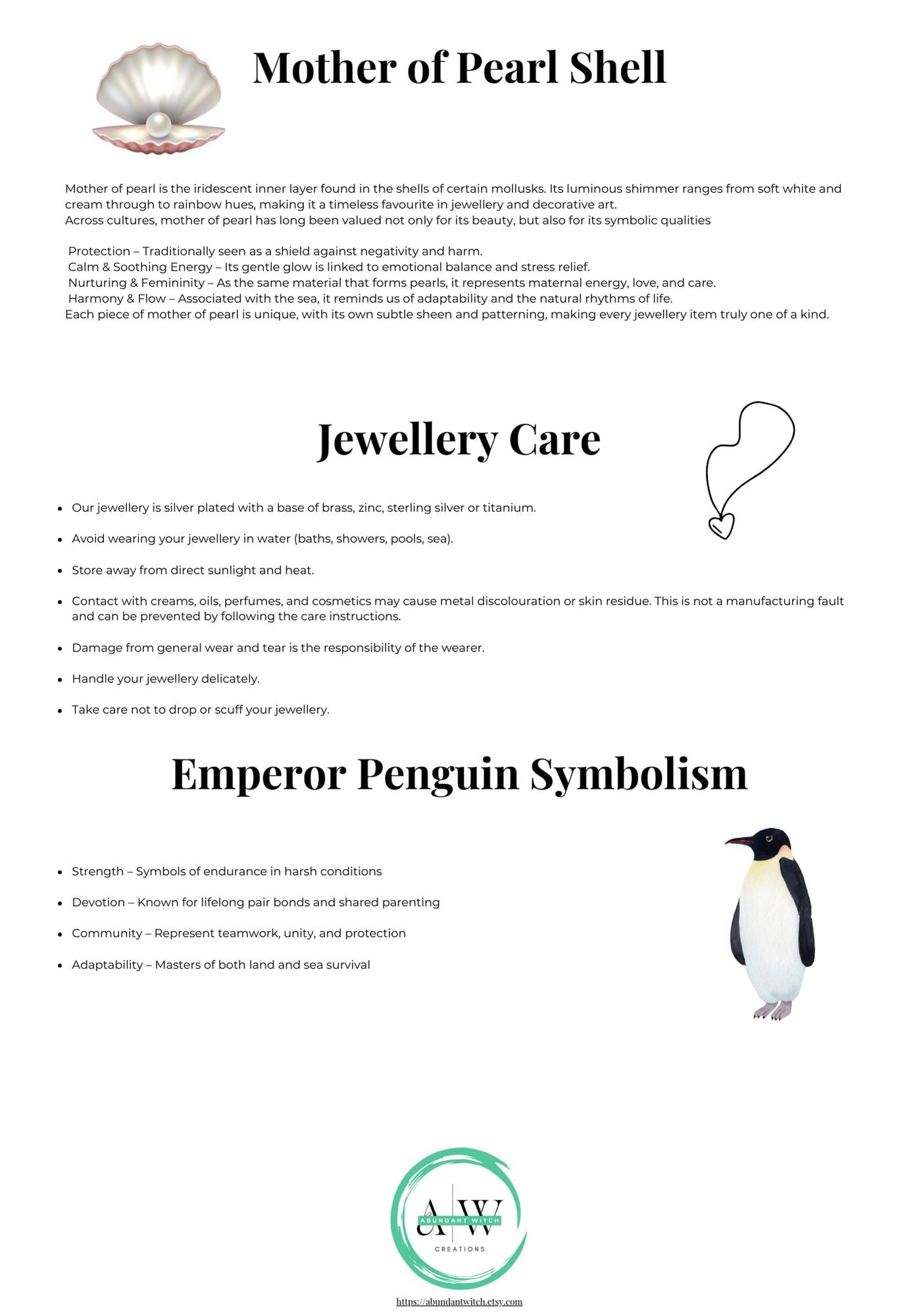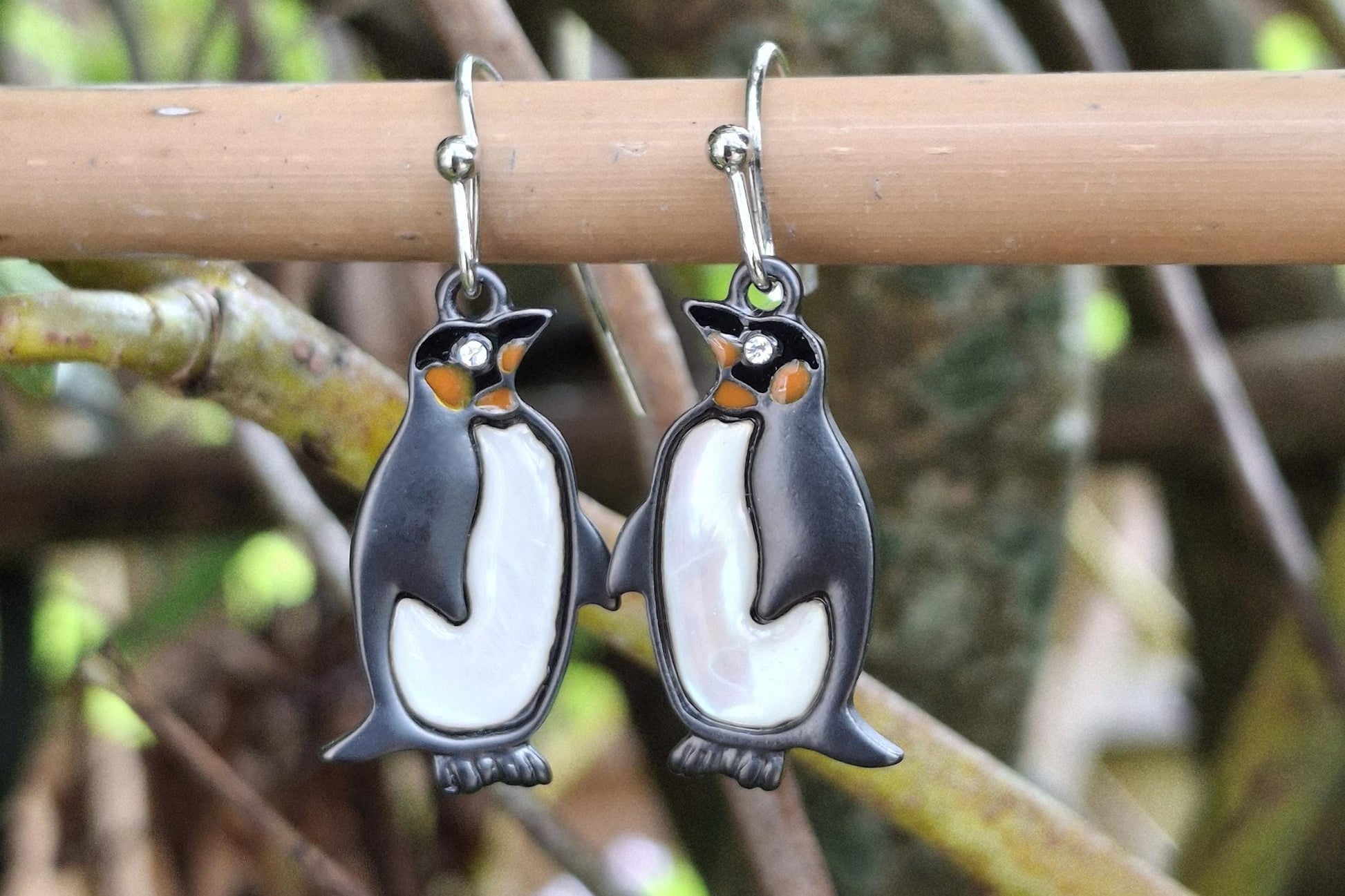 Bring an elegant touch of the Antarctic to your look with these striking Emperor Penguin earrings. Featuring shimmering mother of pearl shell, detailed black and orange epoxy paint, and a delicate glass stone eye, these miniature penguins capture the charm and majesty of the world’s largest penguin species.
