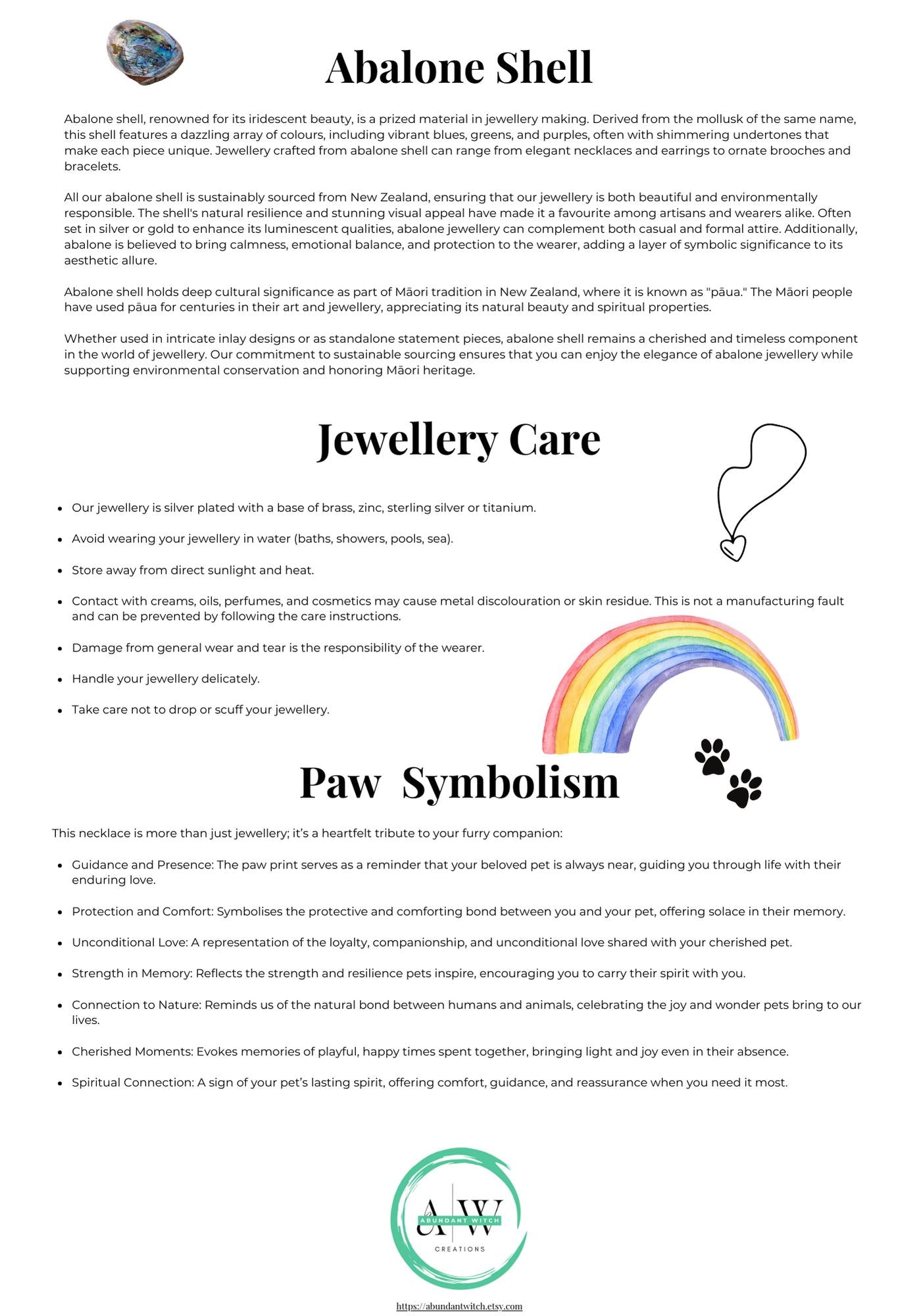 Abalone shell, also known as Paua shell or Sea Opal, is prized for its iridescent beauty and cultural significance. Sustainably sourced from New Zealand and steeped in Maori tradition, each shell is unique, symbolising peace, harmony, and good fortune. This piece serves as a touching memorial, capturing the beauty and spirit of your beloved pet.